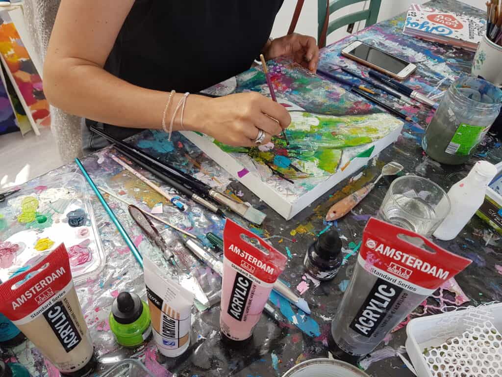 In mijn atelier vind je alle materialen waar je volop mee kan experimenteren: kwasten, vele kleuren verf, sjablonen, mediums, paletmessen, allerlei collage materiaal en nog veel meer.